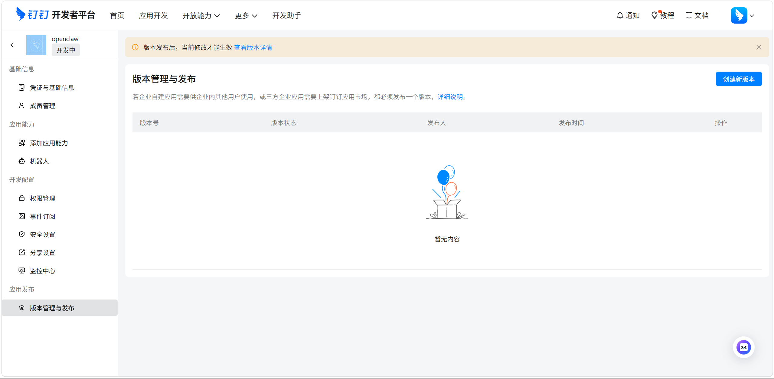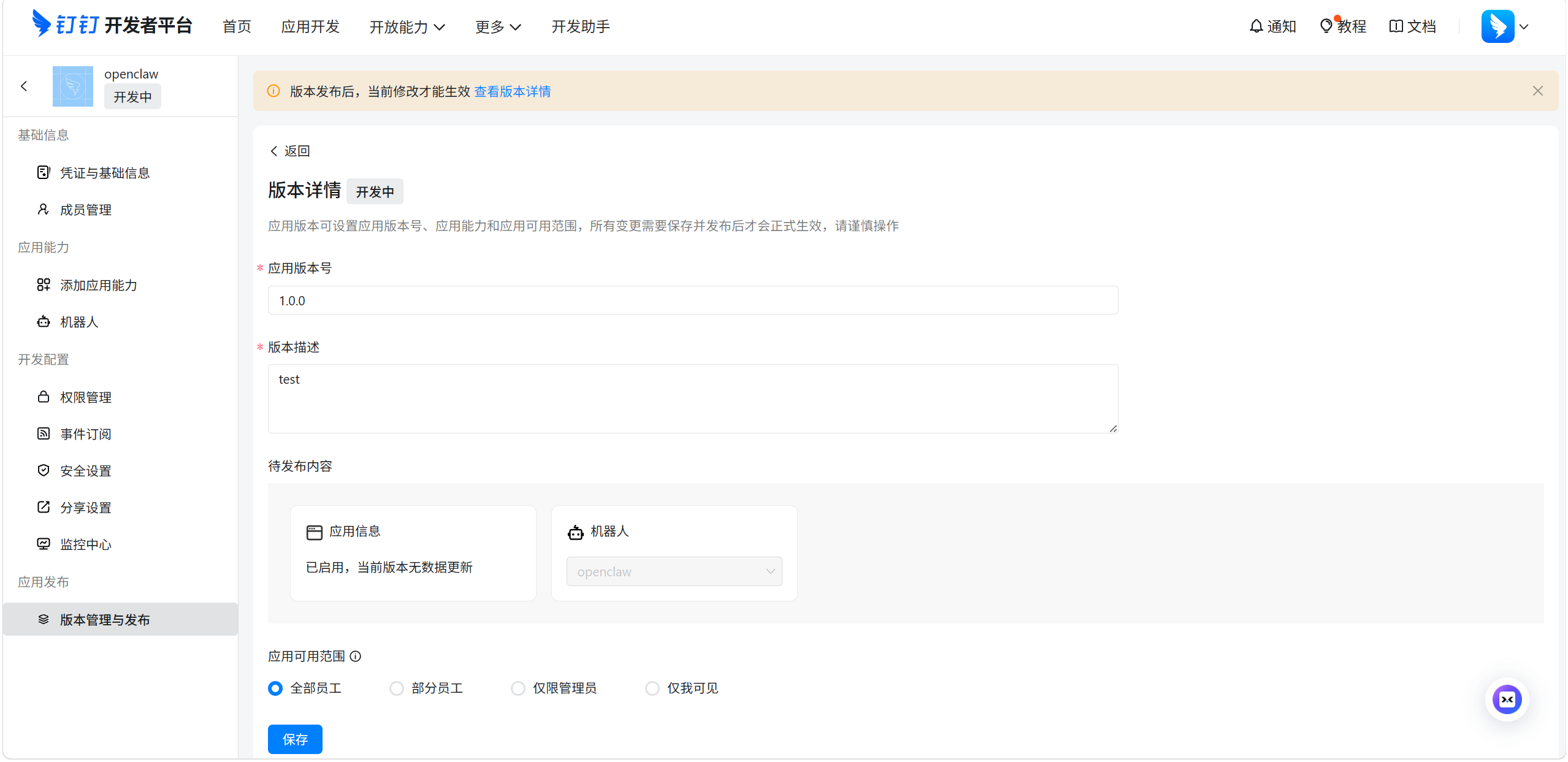 2、配置完成后,进入版本管理与发布界面,保存当前配置并发布应用,确保应用配置生效。