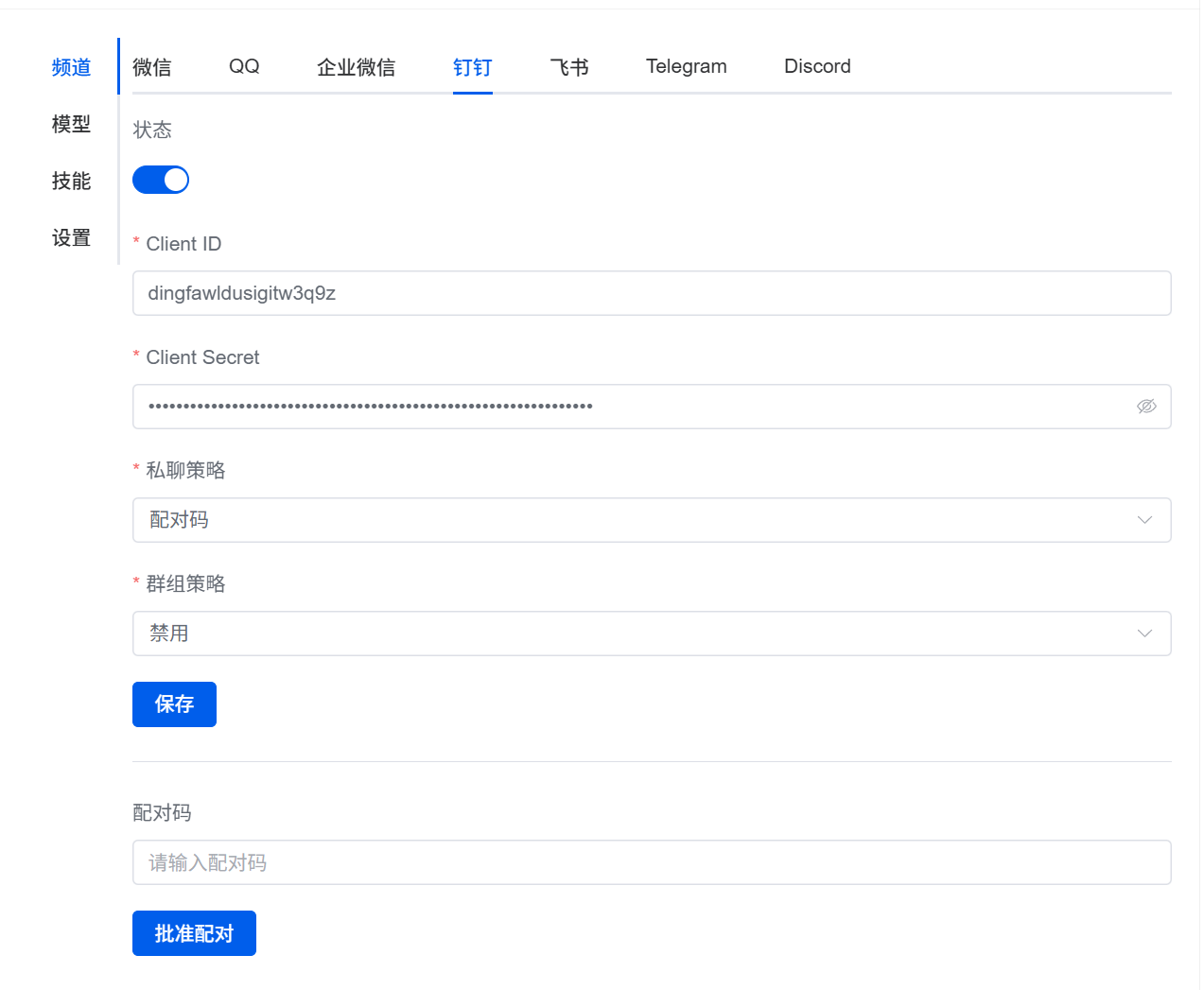 2、配置完成后点击保存,OpenClaw 与钉钉的连接已成功建立。