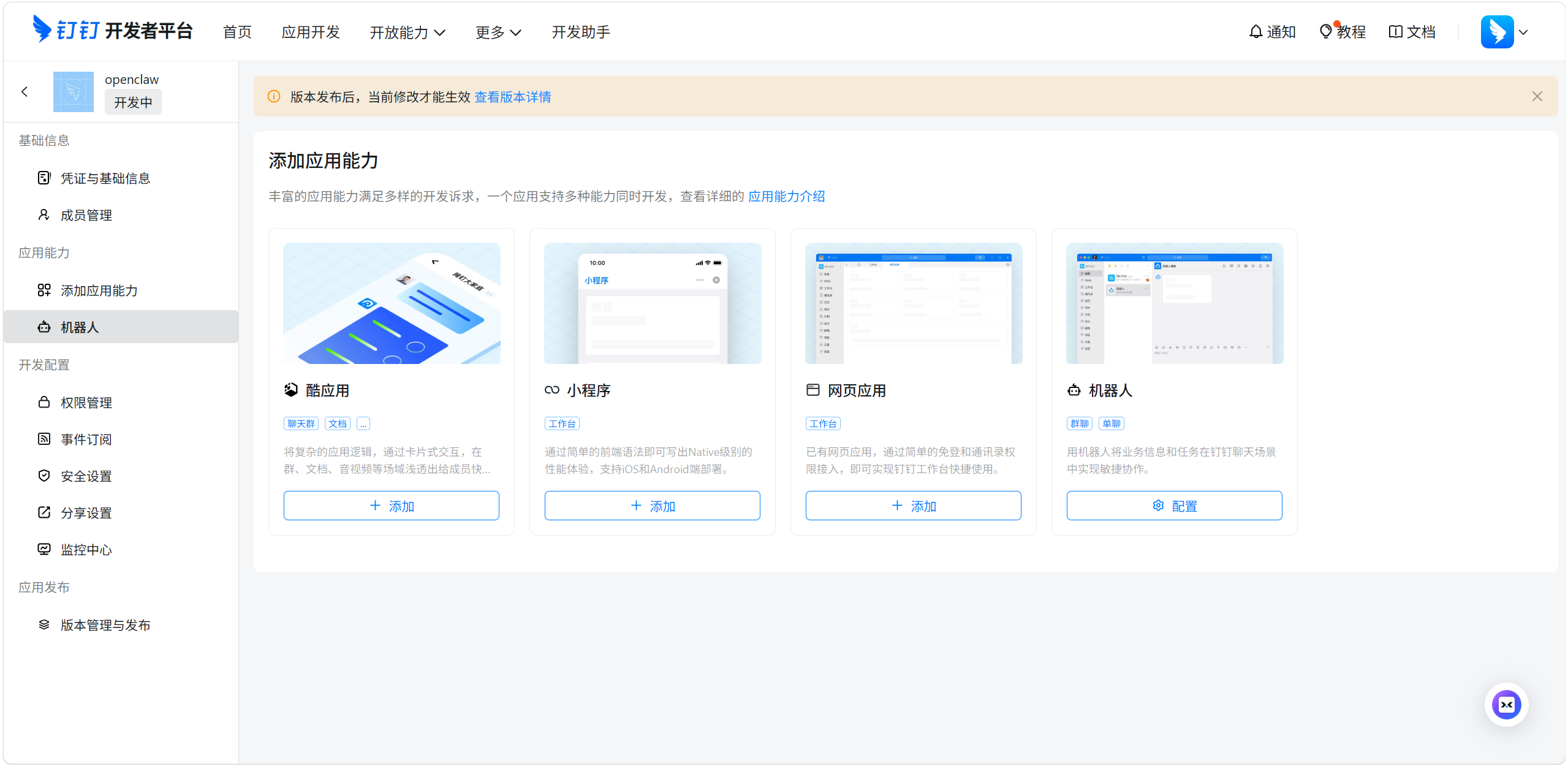 3、应用创建成功后,进入应用能力模块,点击添加应用能力,选择机器人能力进行添加。