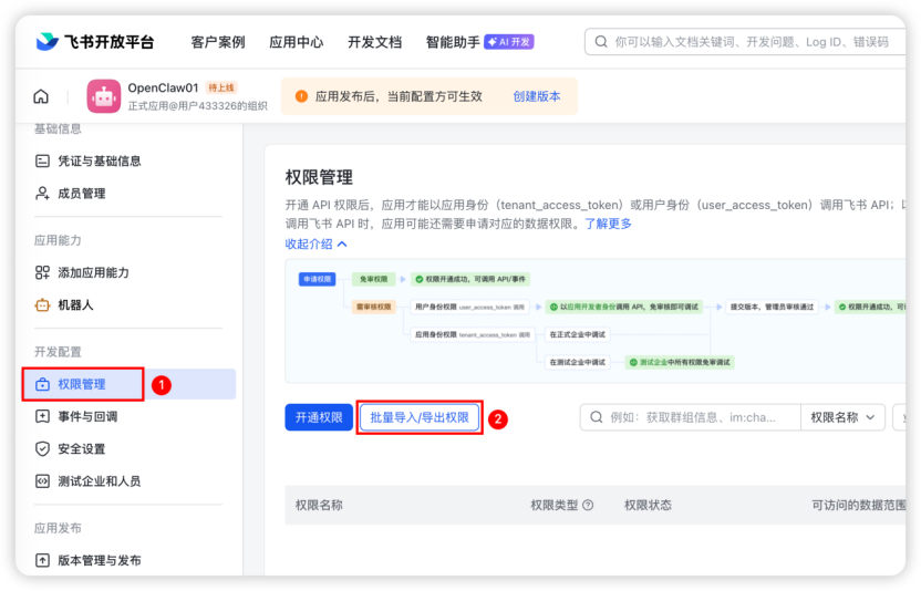 完成机器人创建后,点击进入「权限管理」,并点击「批量导入/导出权限」。