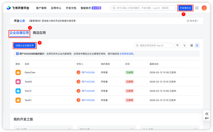 首先我们登录飞书进入飞书开放平台(链接:https://open.feishu.cn/app?lang=zh-CN )进入「开发者后台」,选择「企业自建应用」,点击「创建企业自建应用」,如下图所示: