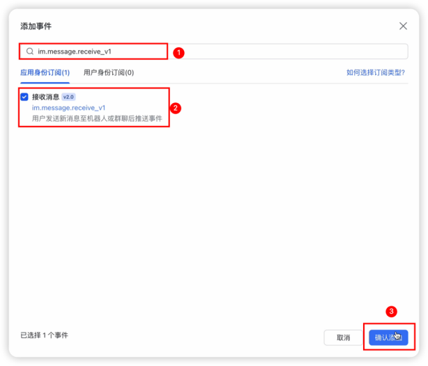 添加事件:输入im.message.receive_v1搜索,基于「应用身份订阅」勾选接收消息,最后确认添加即可。