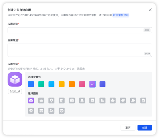 如下图所示,根据要求输入相关应用名称以及基本信息点击创建即可。