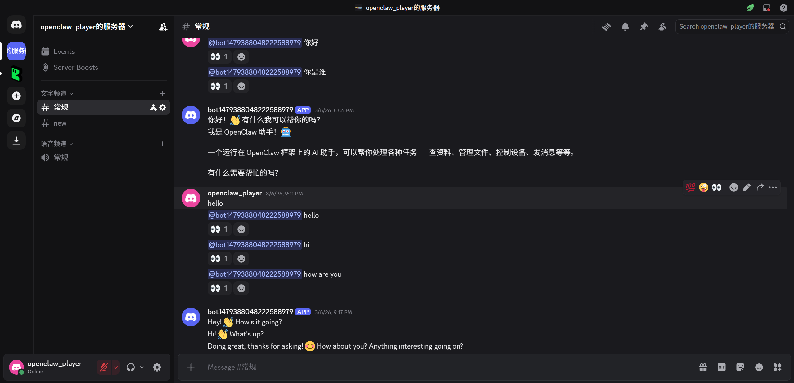 打开 Discord,找到 OpenClaw 机器人,发送基础测试指令: