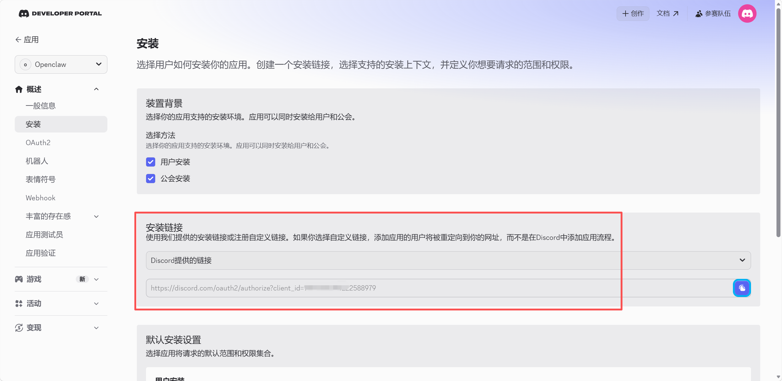 打开Discord 开发者平台