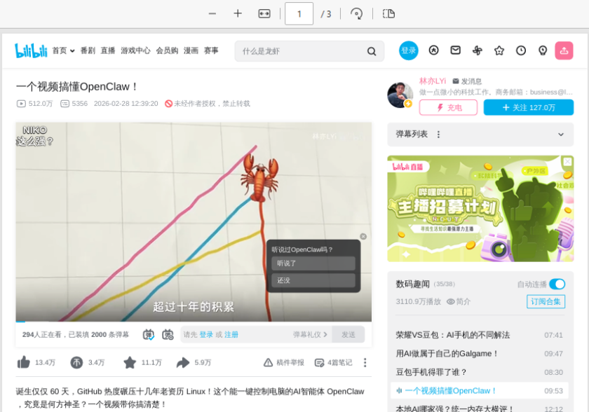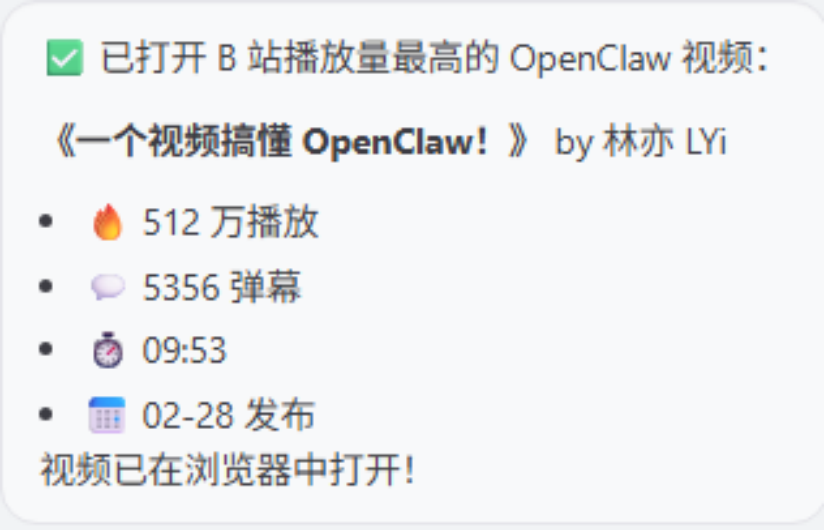 "进入 b 站搜索 openclaw,找到播放量最高的视频并打开"
