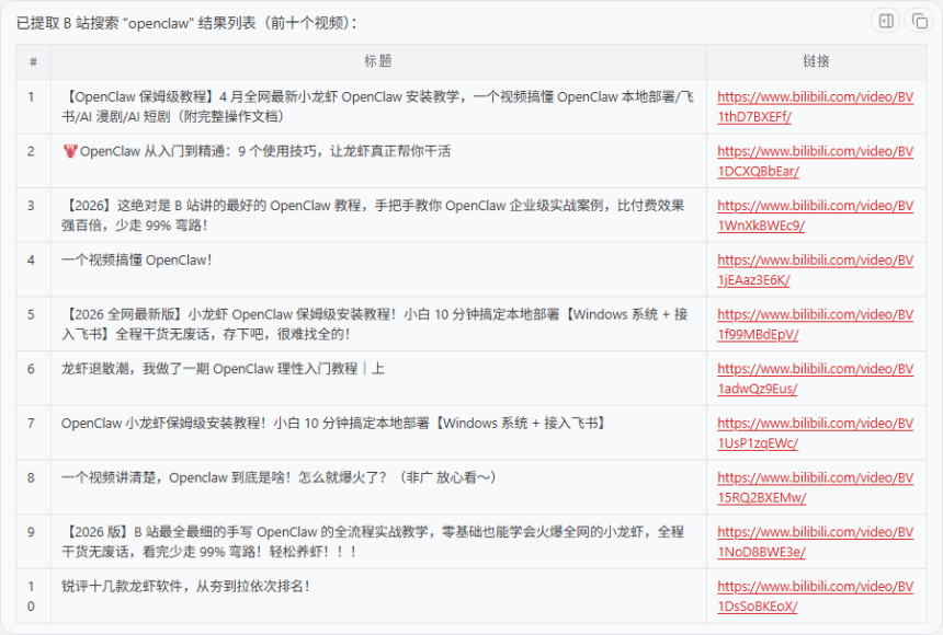 • 结构化提取:提取列表类内容(如 B 站视频列表的标题、播放量、UP 主),输出结构化文本;