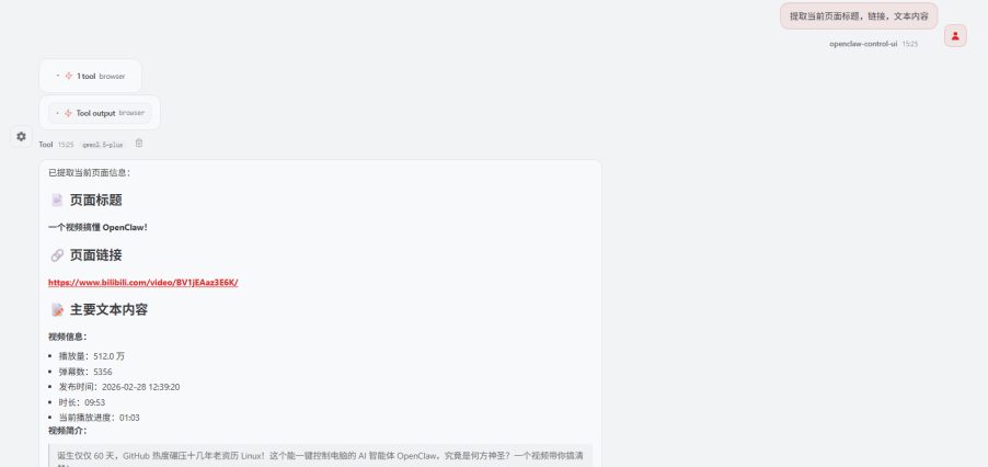 在 OpenClaw 对话界面,直接用自然语言或简单指令控制浏览器自动化: